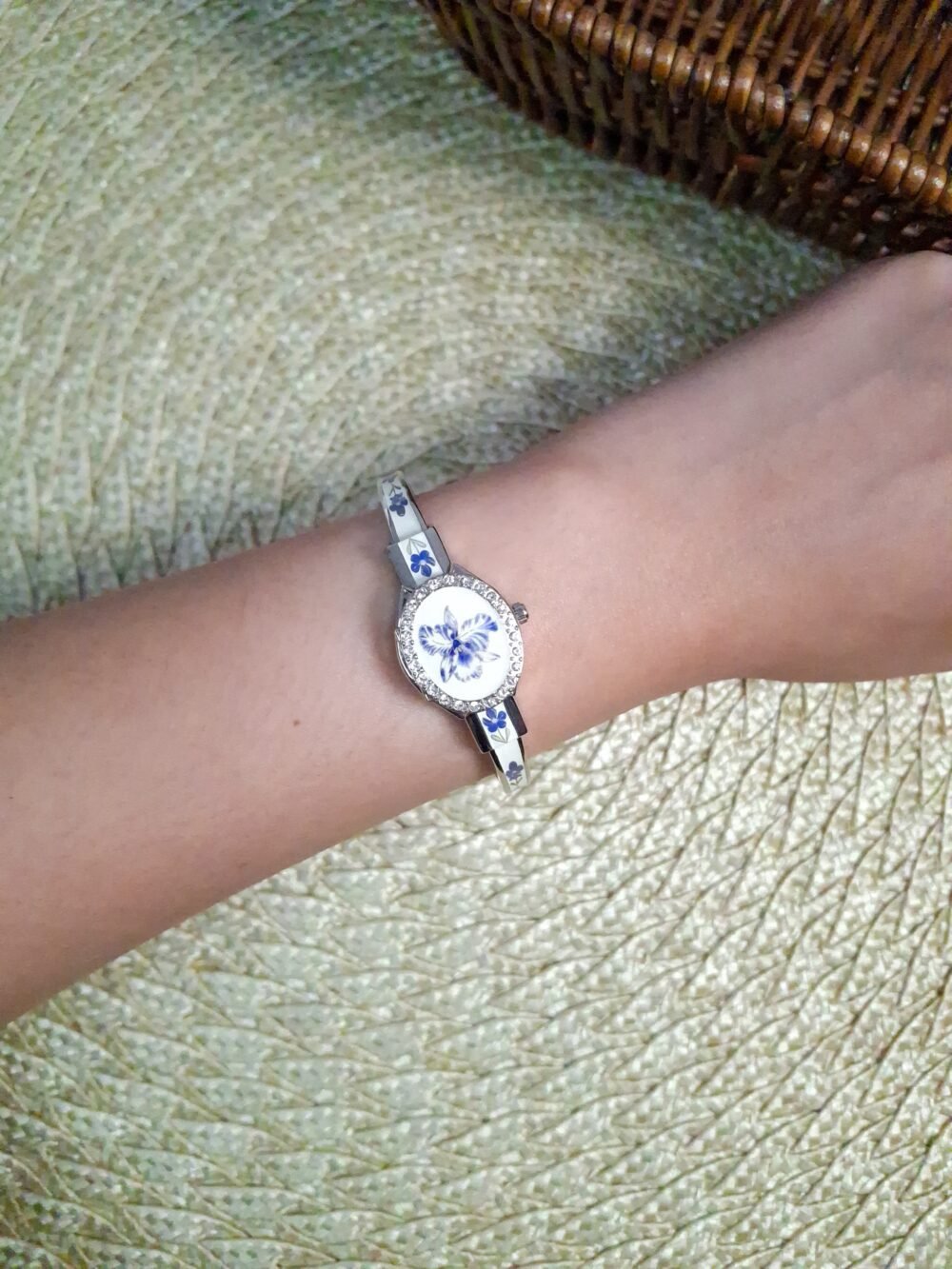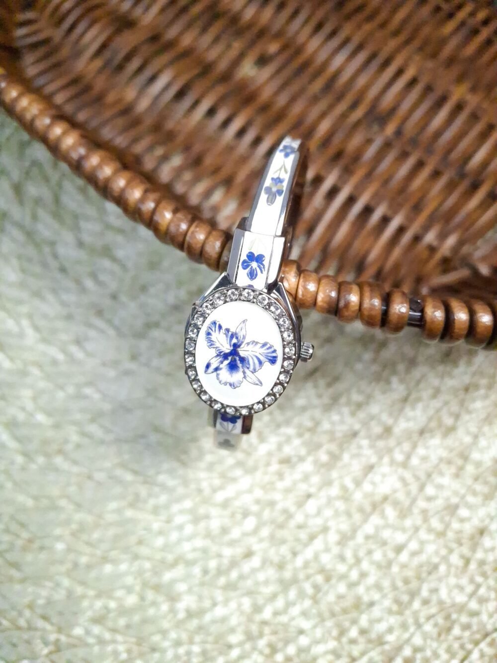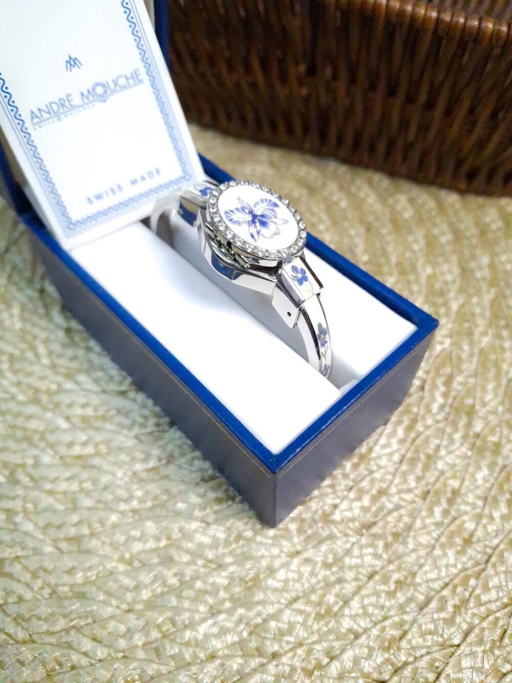 André Mouche Swiss White & Blue Floral Watch