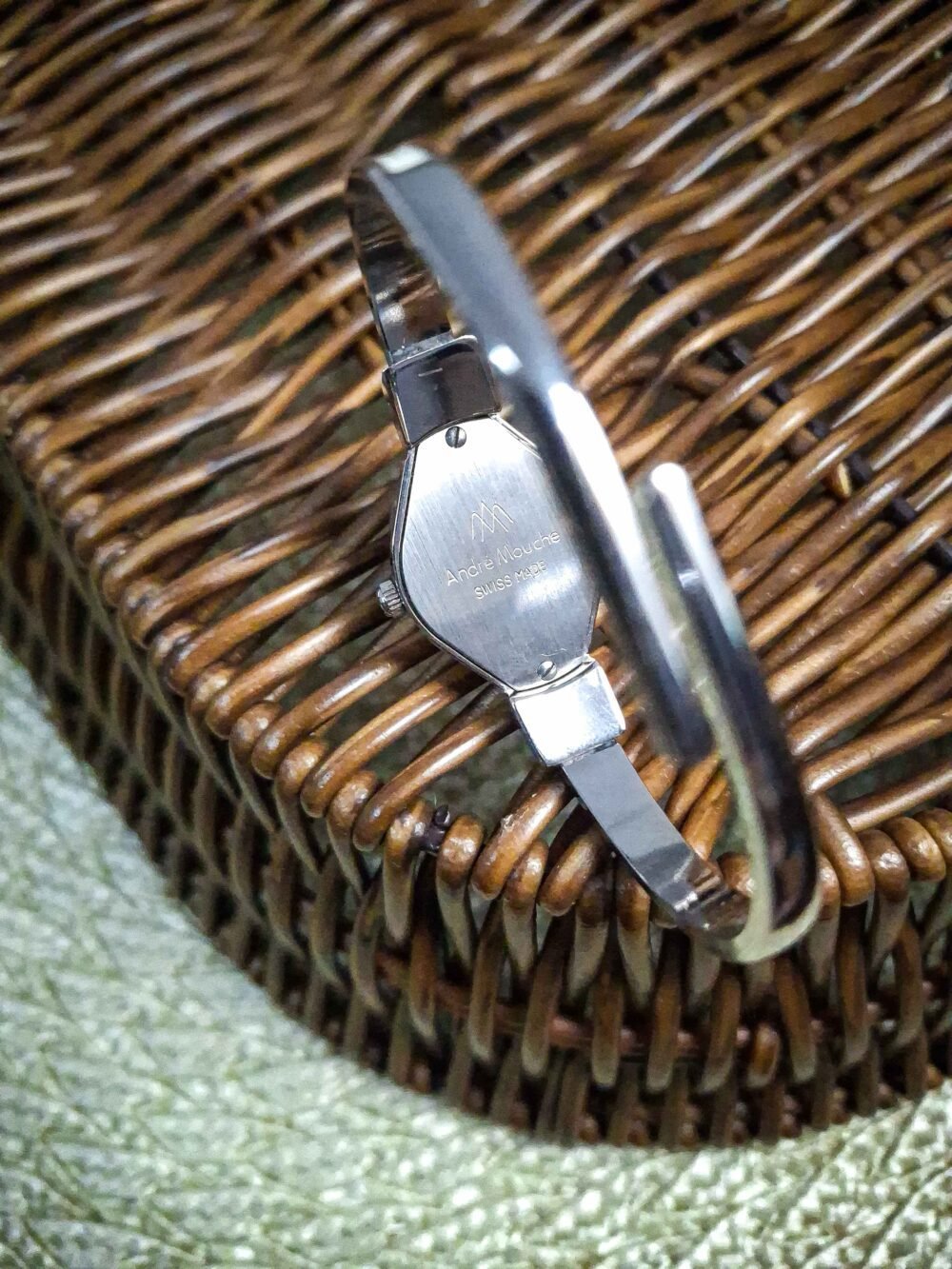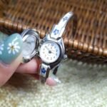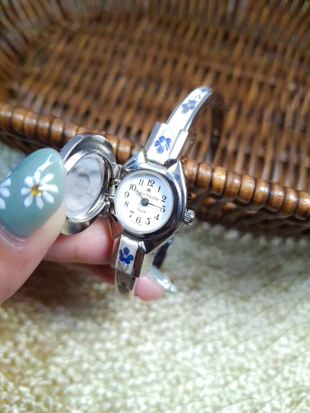 Beautiful vintage André Mouche Swiss-made watch with hand-painted floral enamel and a crystal-studded lid, featuring a polished bangle bracelet adorned with matching floral accents. Showcasing classic femininity and artisanal craftsmanship, the flip-open cover reveals a petite dial beneath — an exquisite blend of jewelry and horology. Fits wrist up to 17 cm with a secure bracelet clasp closure.