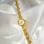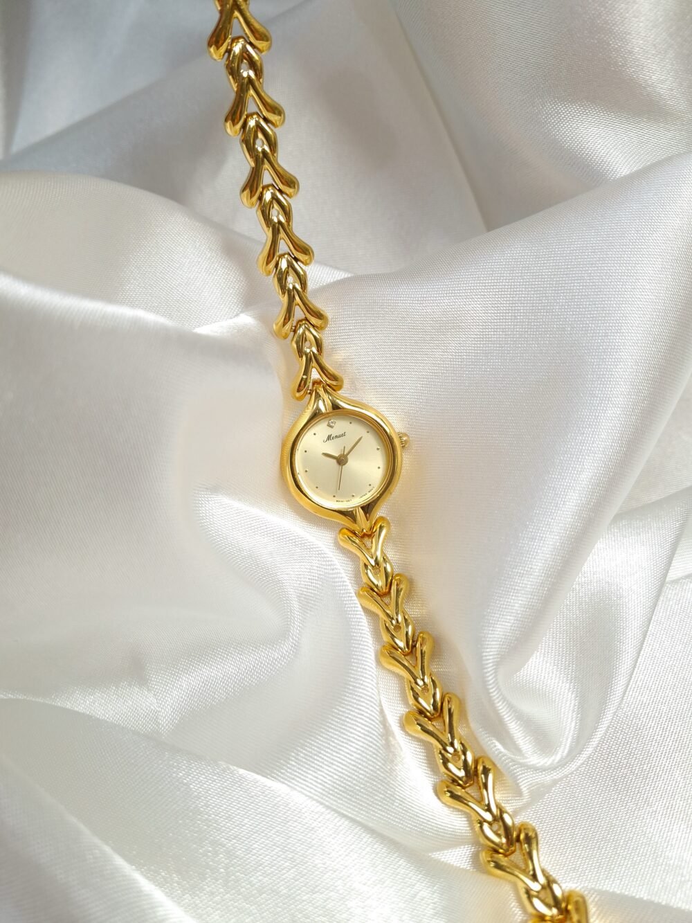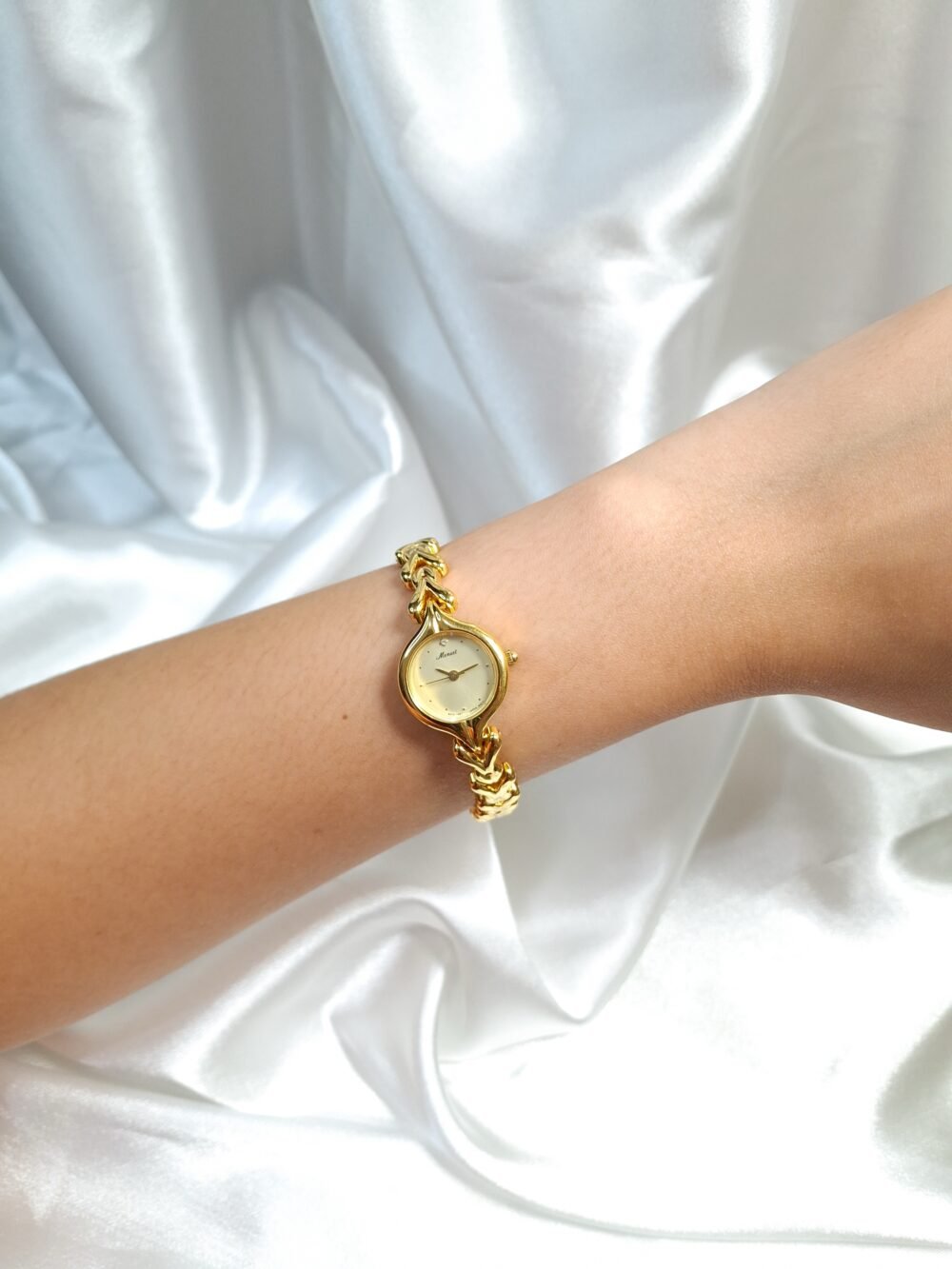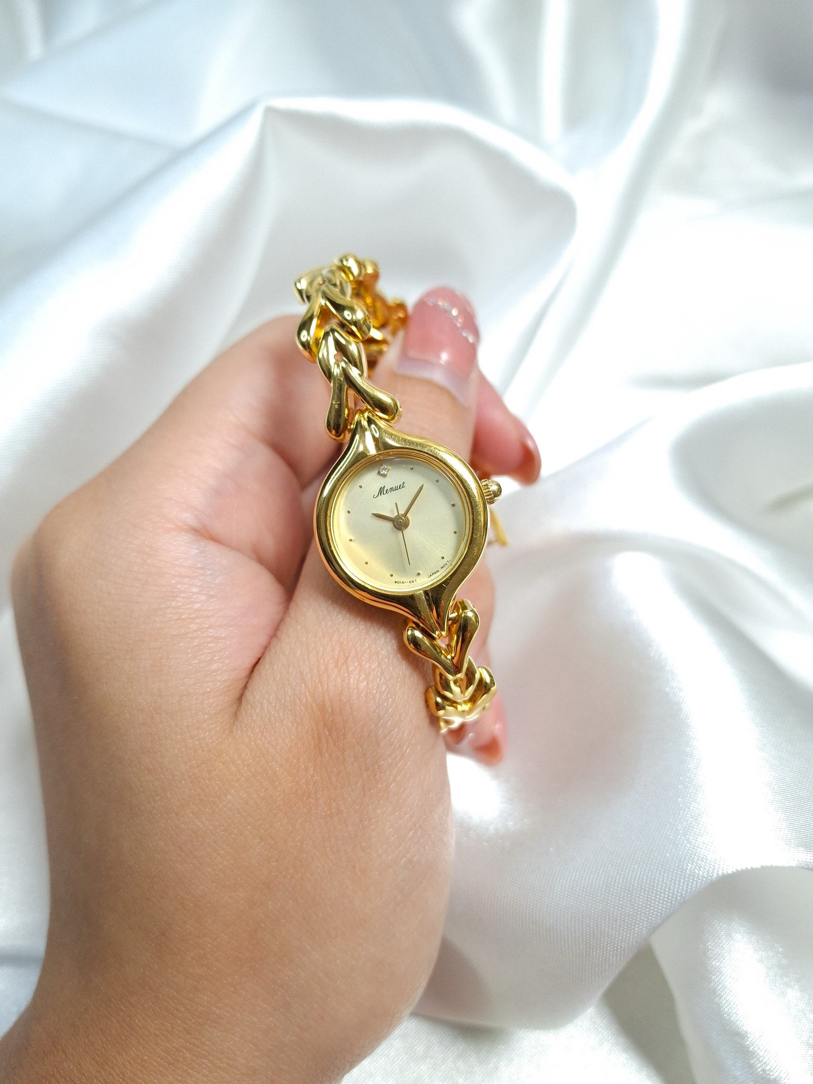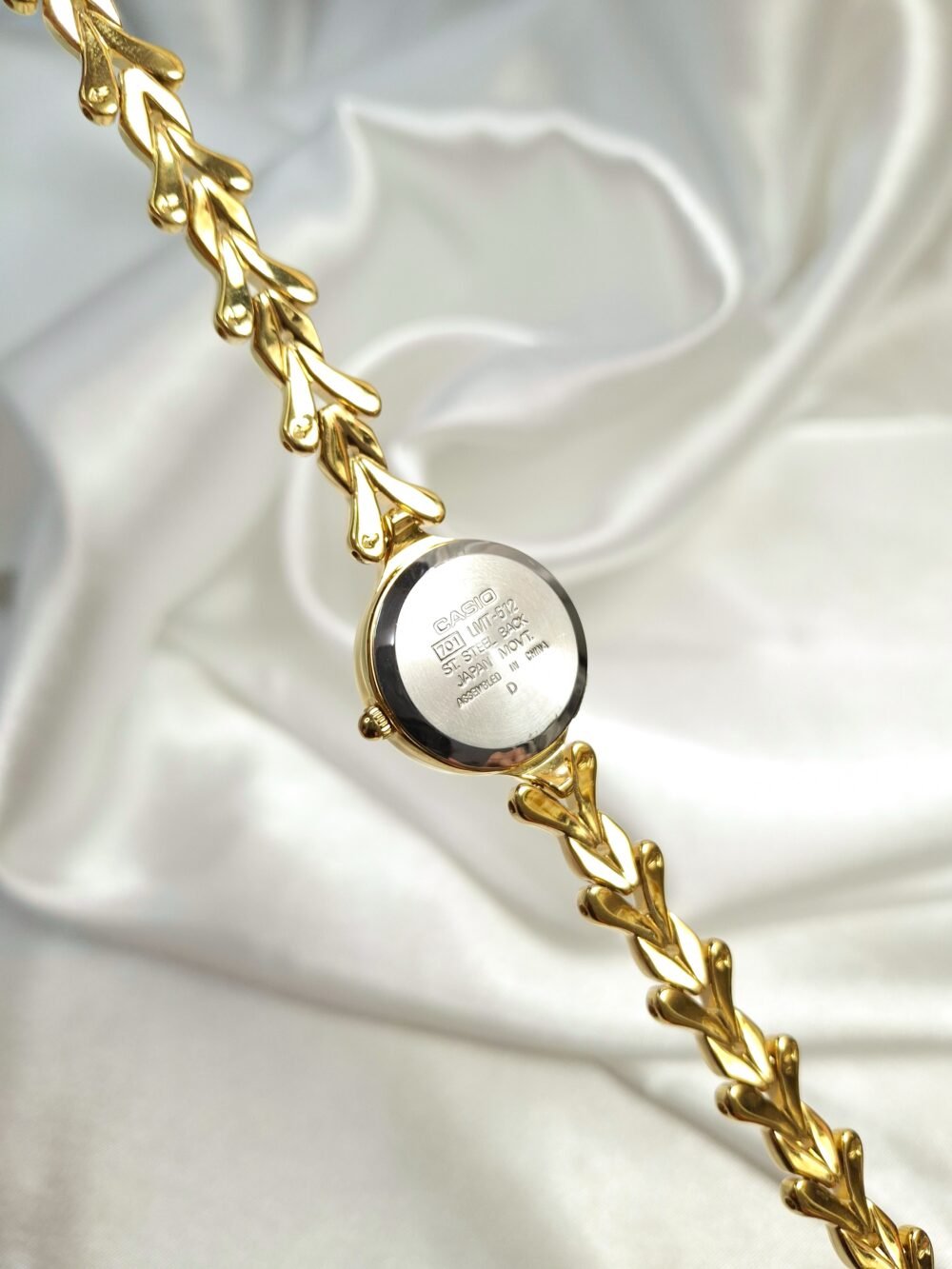 The Casio Menuet LMT-512 brings a soft vintage glow to your wrist with its dainty gold-tone case, minimalist ivory dial, and a beautifully sculpted leaf-link bracelet that flows like fine jewelry. Elegant yet understated, it’s powered by precise quartz movement and secured with a classic jewelry clasp—making it both stylish and practical for daily wear. Splash-resistant and timeless in design, this piece is a sweet favorite among fashion lovers and vintage watch collectors alike. Perfect for those who adore feminine details with a touch of golden nostalgia.