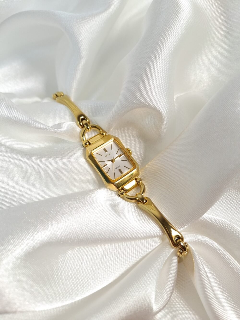 The Citizen Cletia Bangle Watch gracefully blends the timeless elegance of a fine bracelet with the precision of Japanese watchmaking. Its slender rectangular gold-tone case frames a luminous white dial with subtle layered textures, where sleek gold hands glide effortlessly over minimalist hour markers. Flowing seamlessly from case to wrist, the sculptural bangle-style bracelet—polished to a radiant sheen—creates the impression of a refined piece of jewelry rather than a traditional timepiece. Lightweight, sophisticated, and endlessly versatile, Cletia captures the essence of modern femininity in every golden detail.