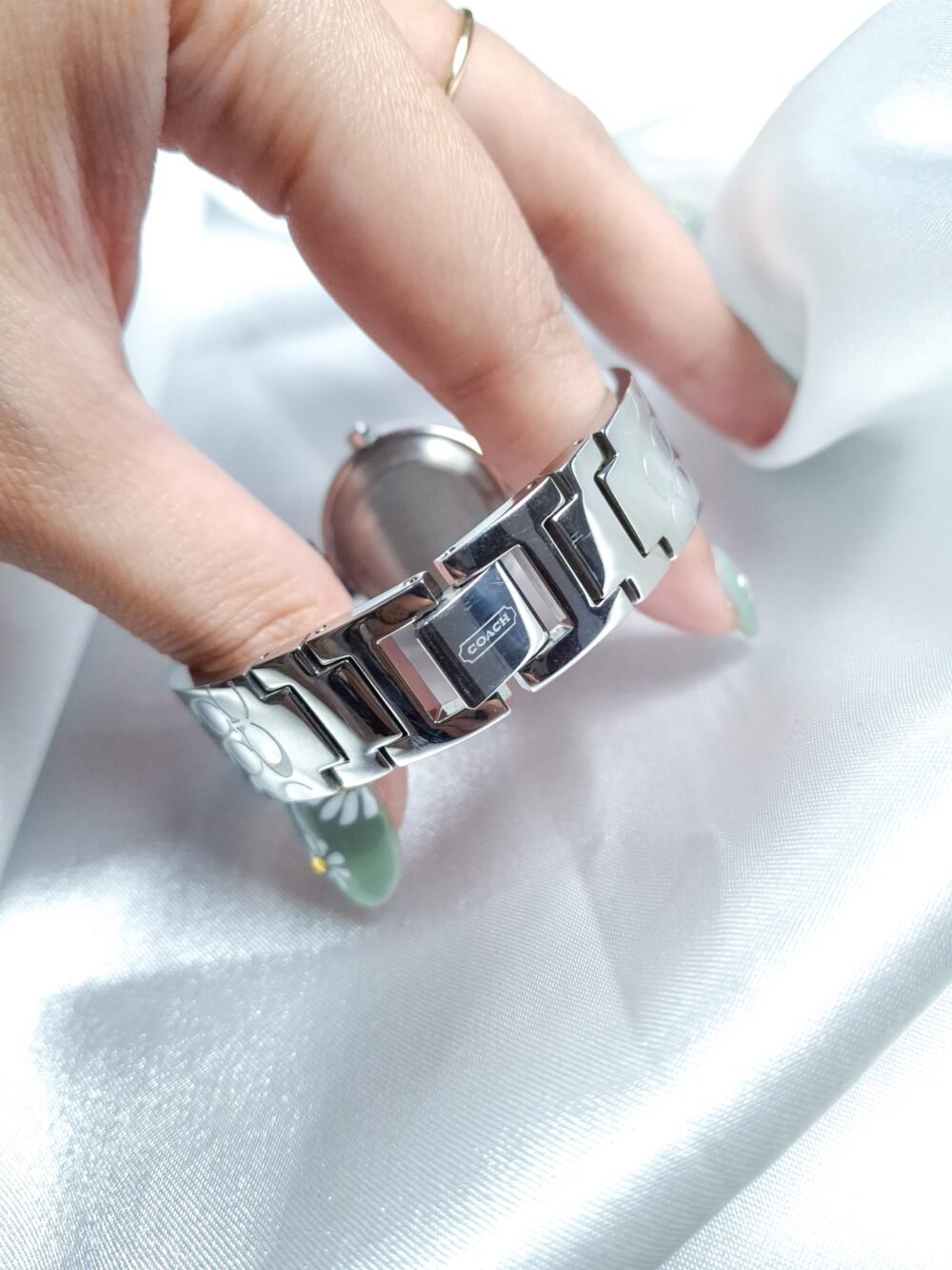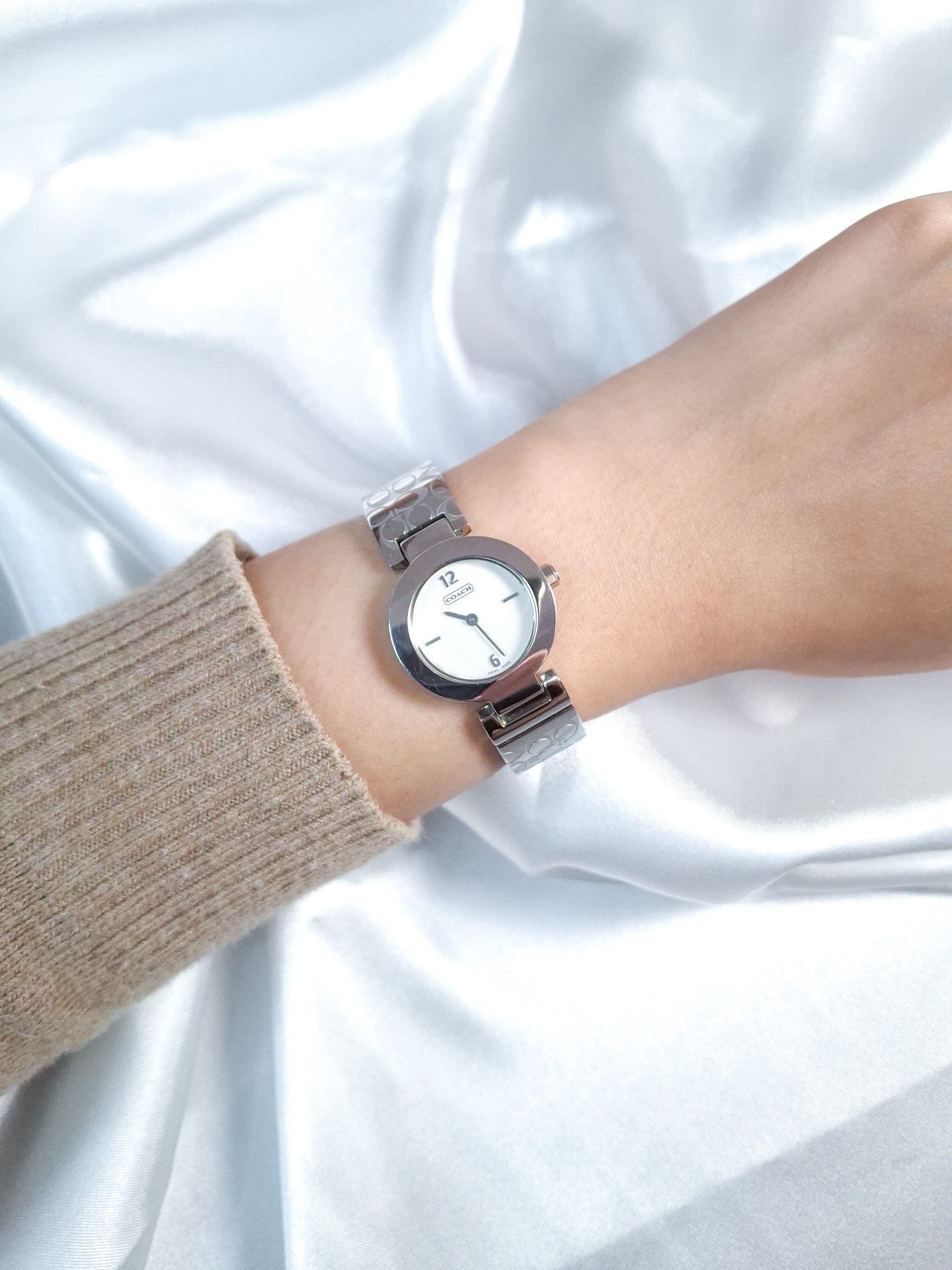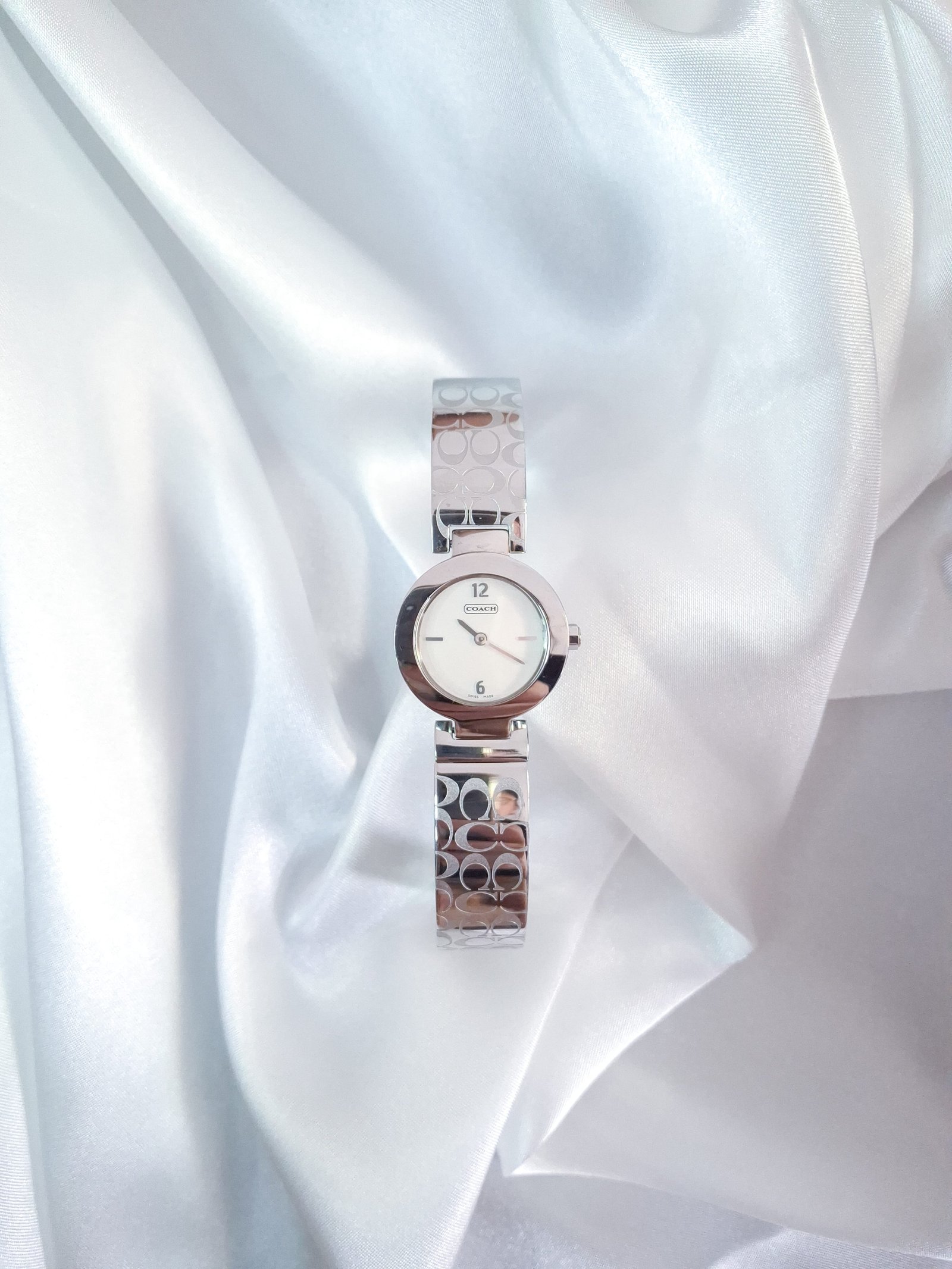 Sleek vintage Coach watch featuring an all-silver tone with the iconic Coach monogram elegantly stamped across the polished bangle bracelet. With its minimalist dial and refined silhouette, this piece effortlessly blends modern design with timeless brand heritage — a chic statement for everyday wear or special occasions.