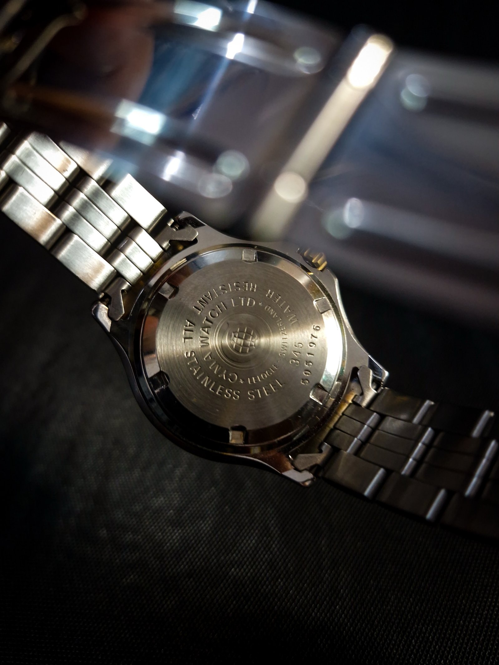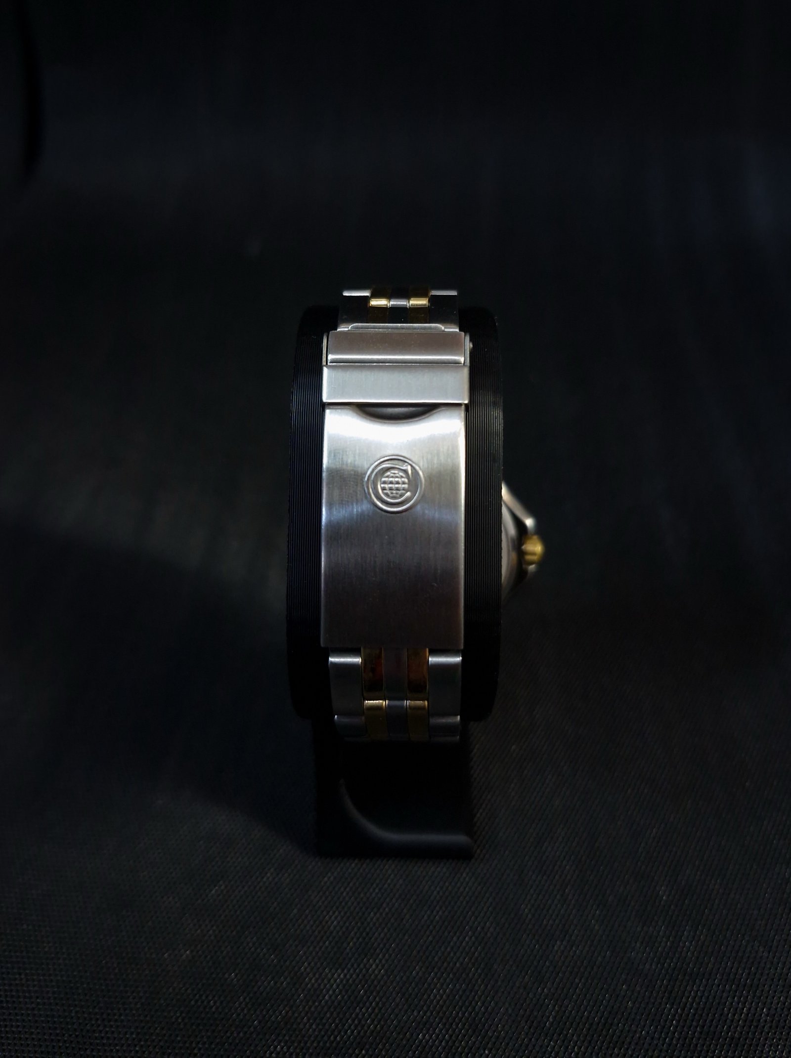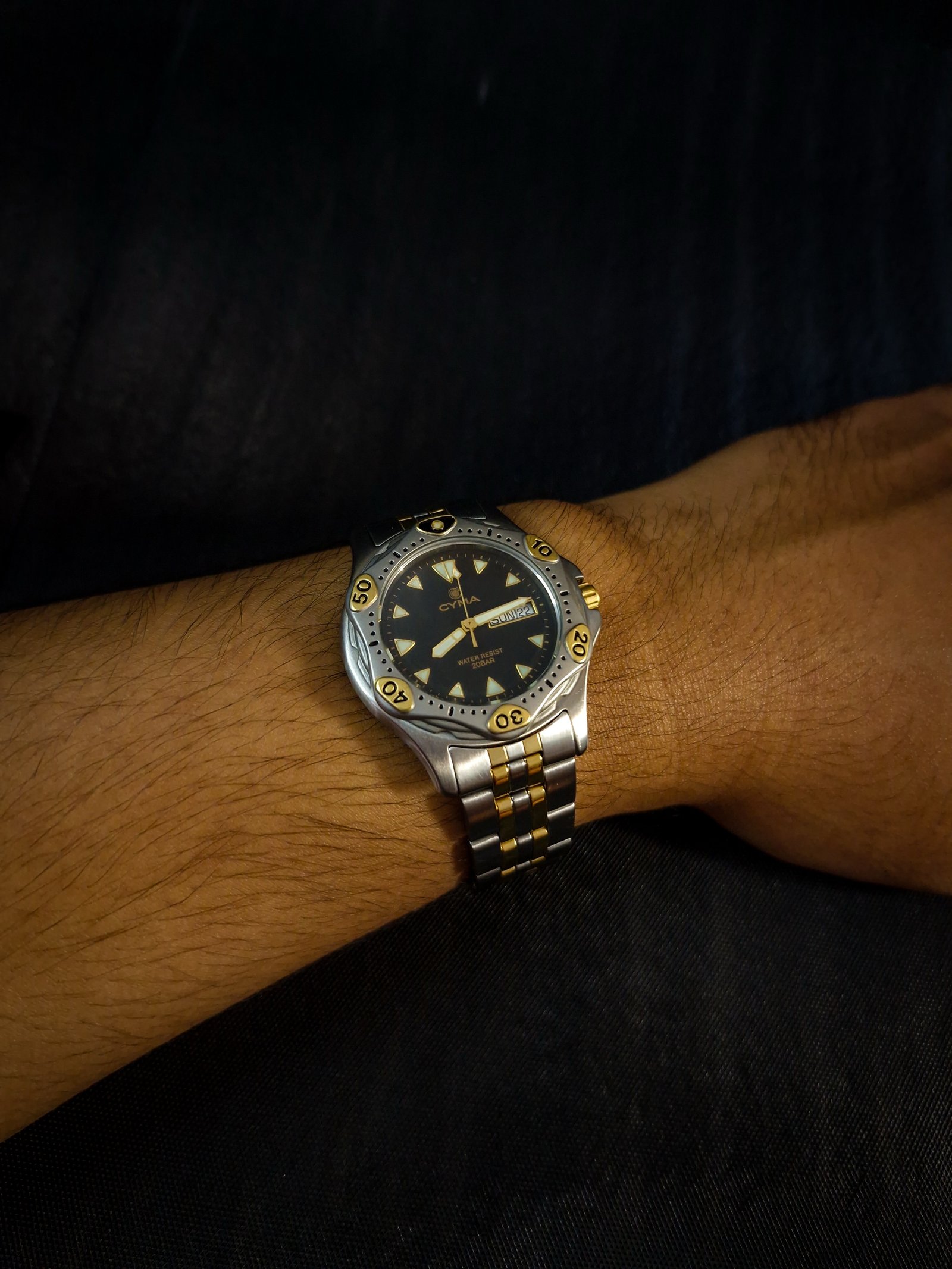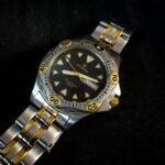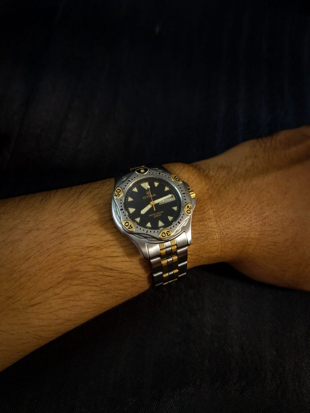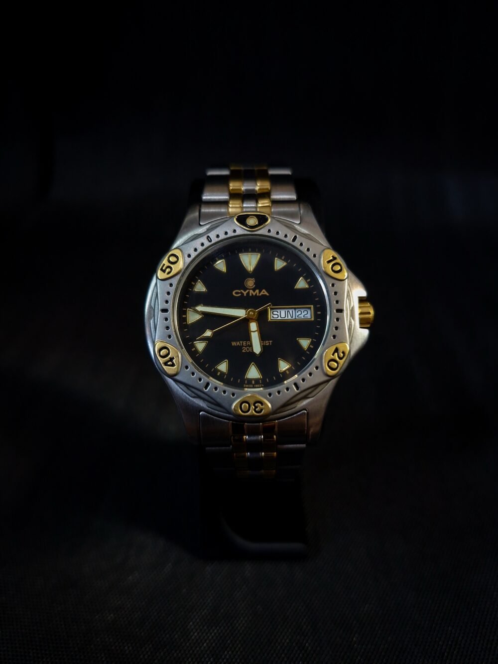 Bold yet refined, this vintage CYMA two-tone timepiece captures the sleek spirit of late-1980s Swiss design. Its black dial is framed by a rotating bezel with gold-accented numerals, while luminous triangular hour markers and sword hands ensure legibility with style. The polished stainless steel case, paired with a brushed and gold-plated bracelet, offers a balanced look—sophisticated enough for formal wear, yet rugged enough for adventure with its 20 BAR water resistance.