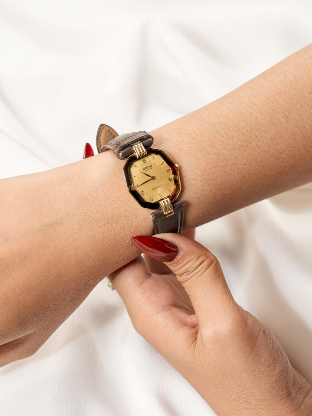 Completing the design is a supple brown leather strap that balances warmth and sophistication, secured with gold-tone lugs that highlight the case’s architectural lines. This watch is powered by a reliable Swiss quartz movement, ensuring both precision and convenience. Elegant yet versatile, the Rado Florence is a statement piece that blends everyday wearability with enduring beauty.