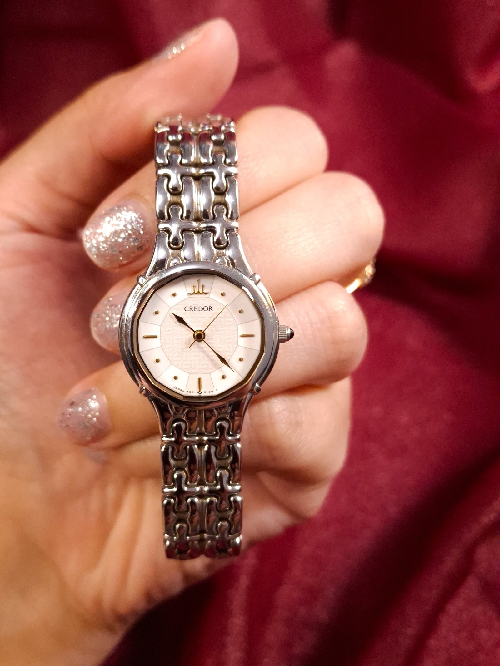 This petite Hattori Seiko Credor wraps the wrist like a piece of fine jewellery. The softly rounded steel case frames a delicate silver dial with a textured guilloché-style centre and smooth outer ring, dotted with petite applied markers and slim gold-tone hands. Paired with an intricate multi-link bracelet that catches the light with every move, it feels refined yet quietly sweet, perfect for dress days or everyday elegance.