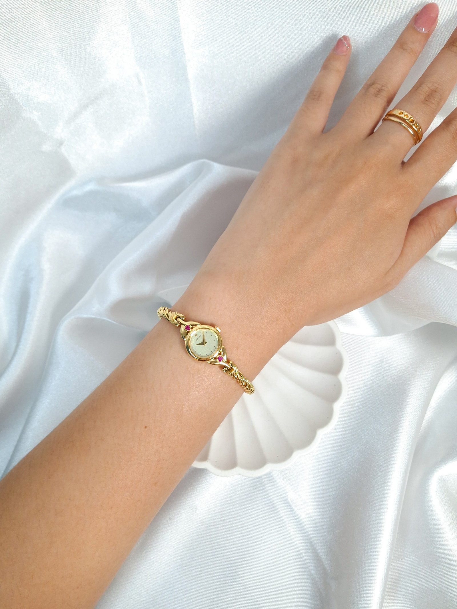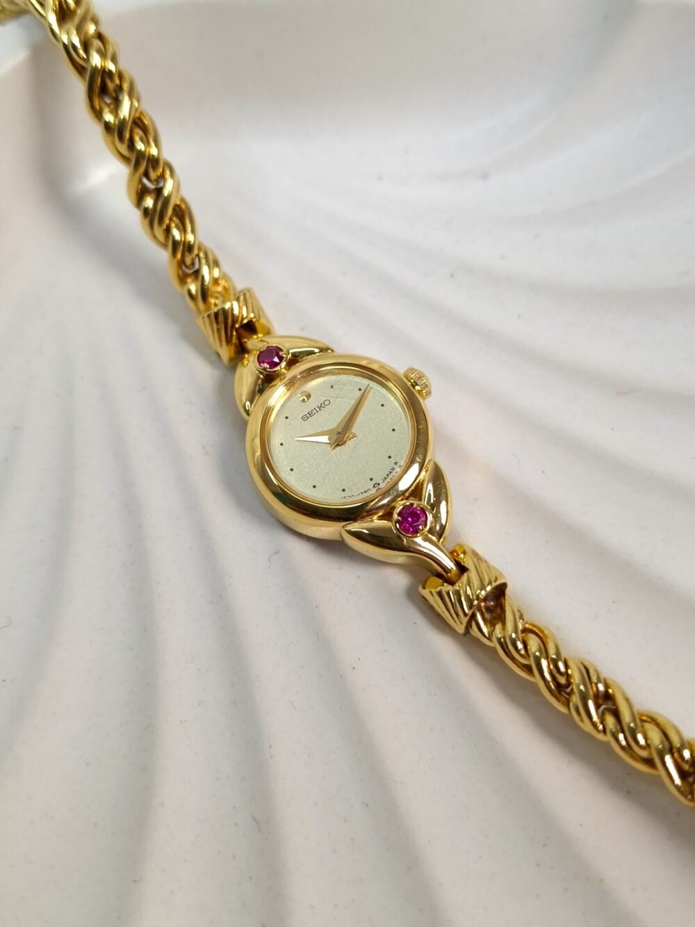 Timeless sophistication meets graceful design in this exquisite Seiko Regal Ruby timepiece. Crafted in a radiant gold-tone finish, the watch features a delicate round case adorned with two brilliant pink gemstones—subtle yet striking touches that elevate its feminine charm. Its champagne-textured dial is minimalist and refined, marked only with fine dot hour markers and slim gold hands. Paired with a beautifully twisted bracelet that drapes the wrist like fine jewelry, this watch is a seamless blend of elegance and wearability. Powered by Seiko’s trusted quartz movement, it offers reliable precision wrapped in vintage allure. Whether you’re dressing up for an occasion or adding a hint of classic luxury to your daily look, this rare Seiko 1E20-0430 model is a collectible accessory that speaks volumes of timeless beauty.