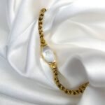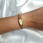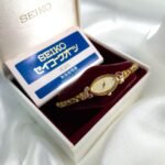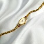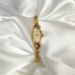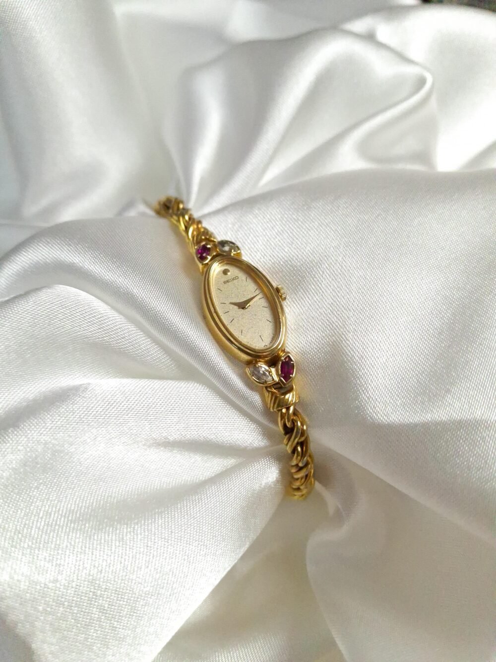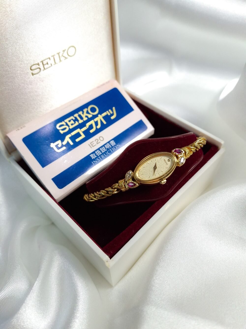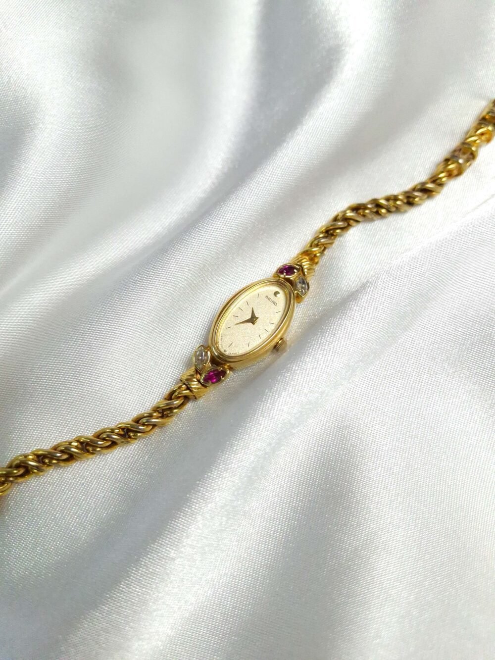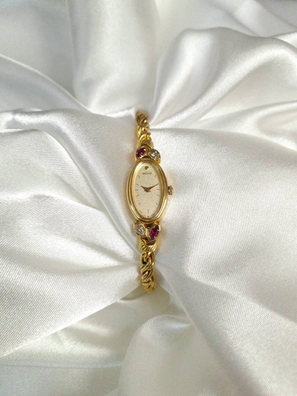 The Seiko 1E20-5760 is a vintage women’s wristwatch featuring a slim, elongated gold-tone case with a champagne-colored oval dial. The watch is adorned with two marquise-cut ruby accents and two marquise-cut diamond accents, adding a touch of elegance and luxury. The bracelet is designed in a twisted rope style, complementing the overall delicate and feminine aesthetic.