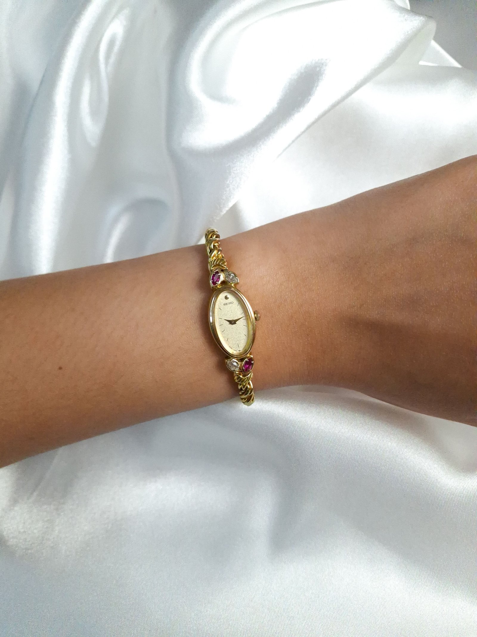 The Seiko 1E20-5760 is a vintage women’s wristwatch featuring a slim, elongated gold-tone case with a champagne-colored oval dial. The watch is adorned with two marquise-cut ruby accents and two marquise-cut diamond accents, adding a touch of elegance and luxury. The bracelet is designed in a twisted rope style, complementing the overall delicate and feminine aesthetic.