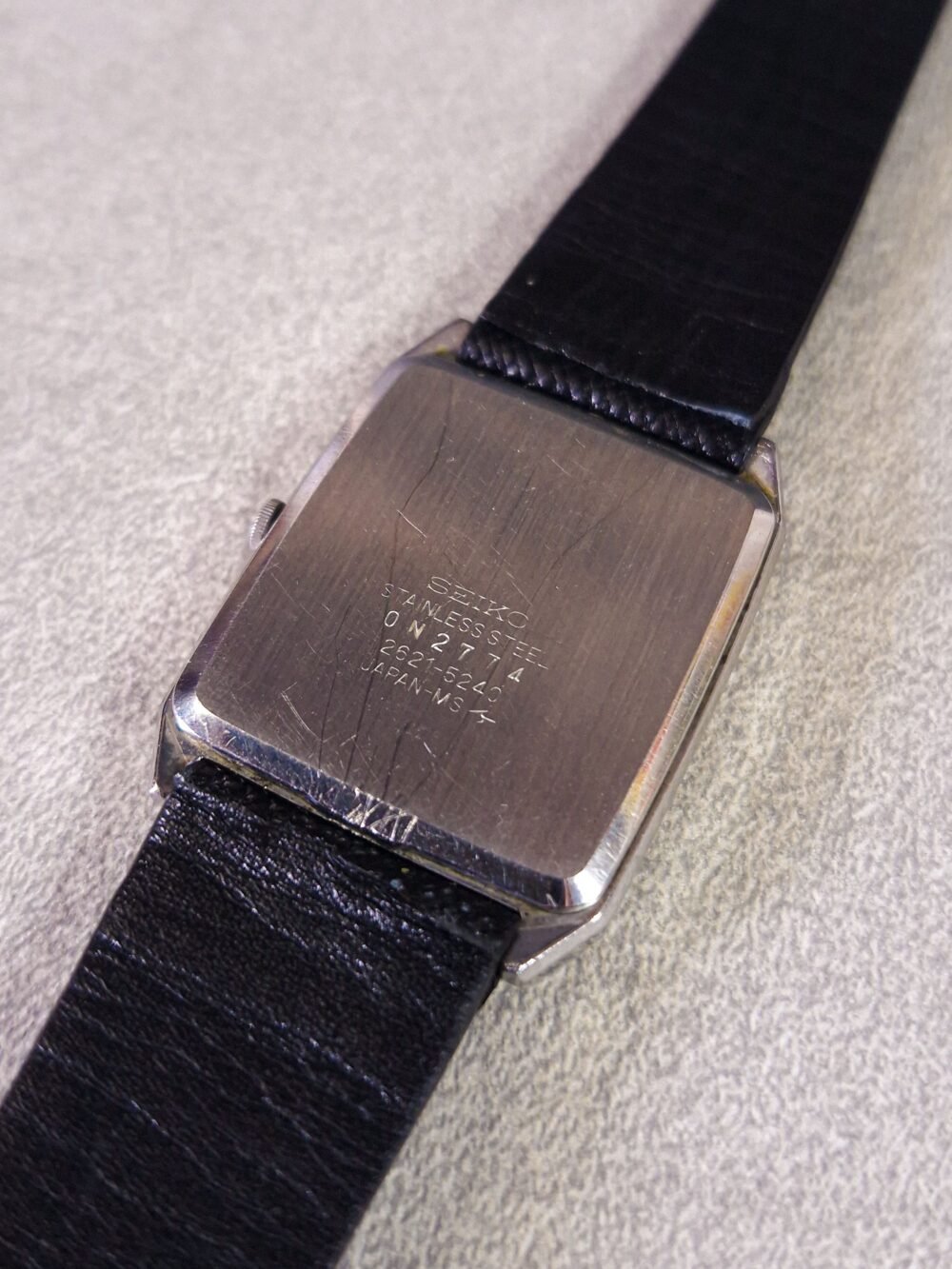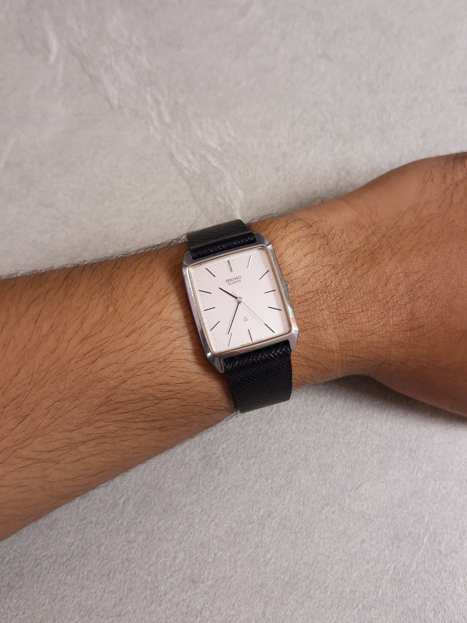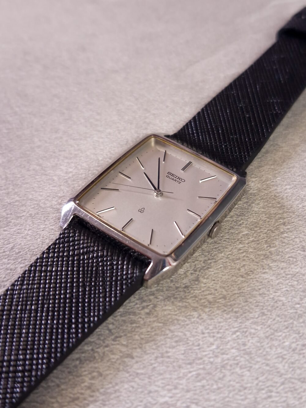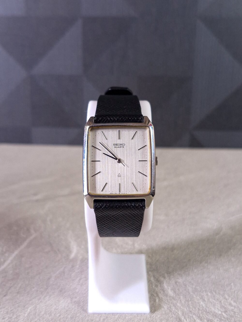 The Seiko 2621‑5240 is a refined vintage quartz dress watch from Seiko’s Daini factory, driven by the precise 2621A movement (32,768 Hz, 2 jewels, hacking, ±15 s/month). It features clean lines and a polished rectangular bezel that perfectly frames the warm gold-toned linen-textured dial, complemented by slim baton hands and markers.