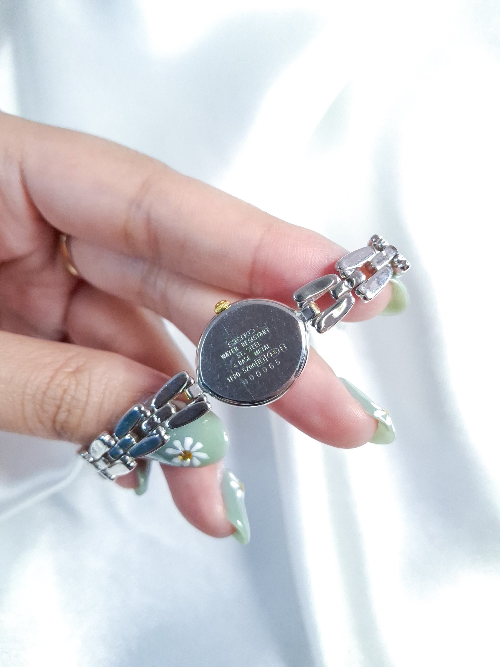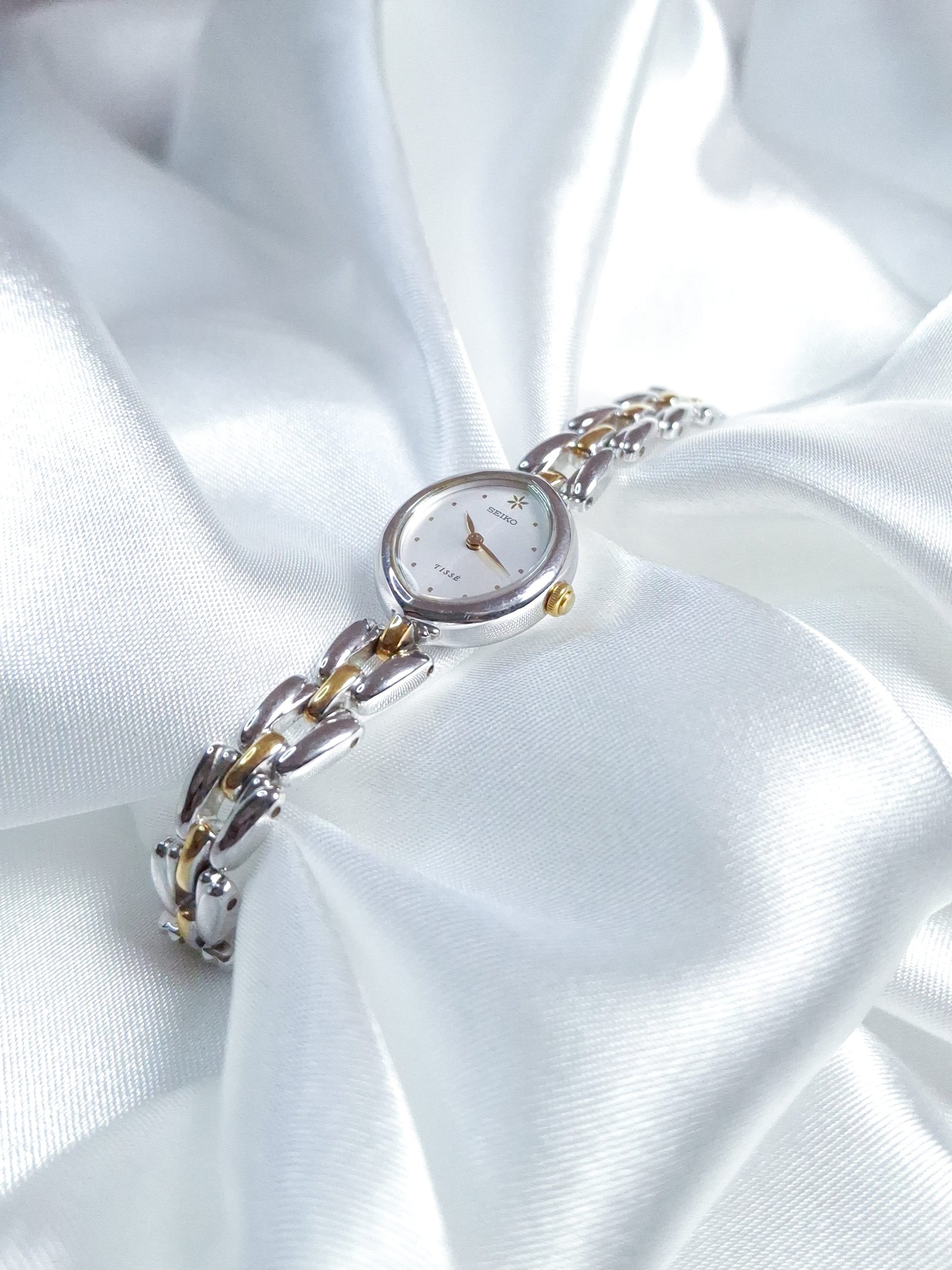 Timeless Seiko Tisse from the 1980s, designed with the spirit of wearable elegance in mind — blending the function of a watch with the charm of jewelry. This dainty two-tone piece features a petite round case, a clean white dial, and a graceful link bracelet in silver and gold tones. Decades later, its delicate style still feels effortlessly modern.