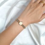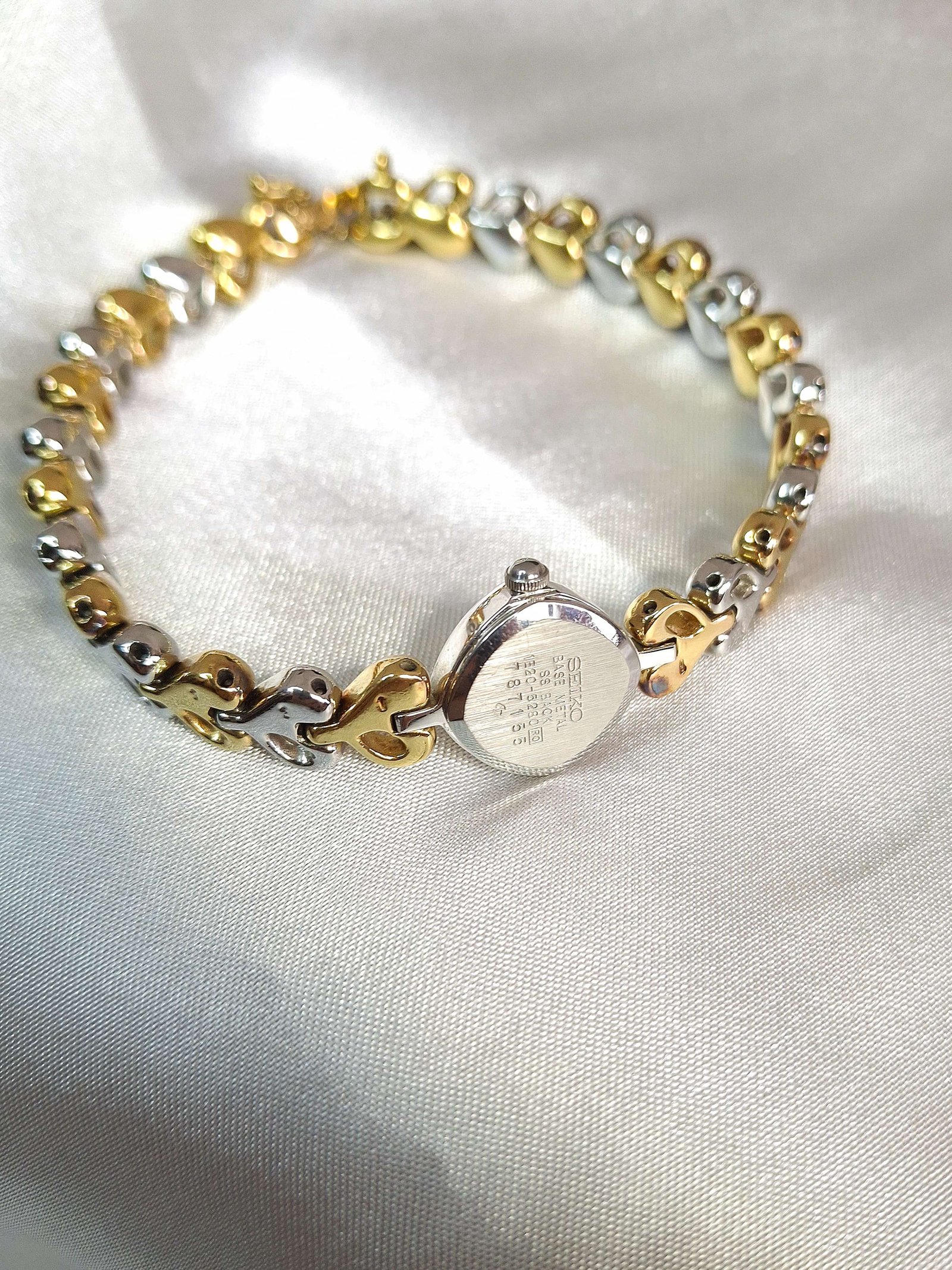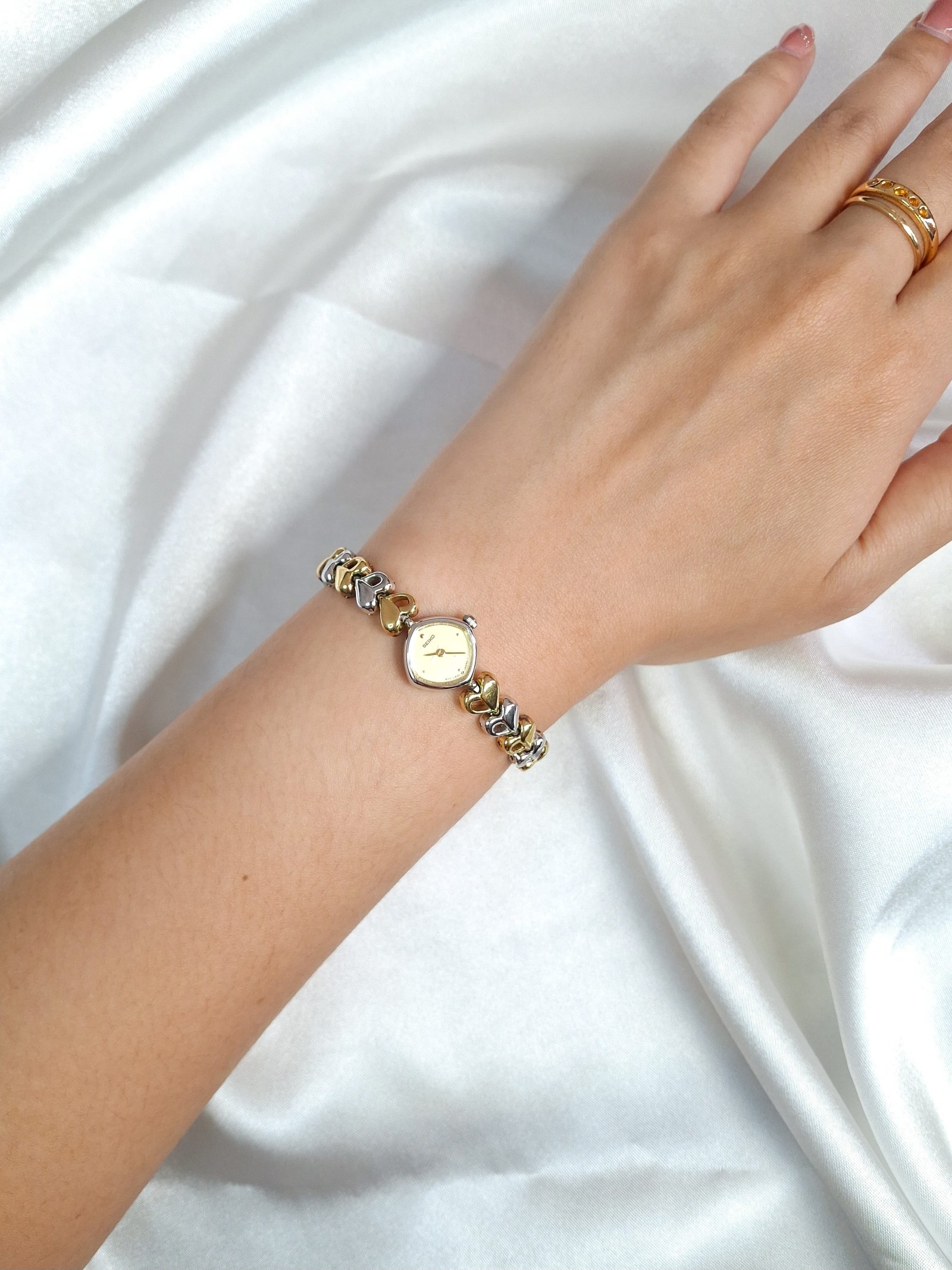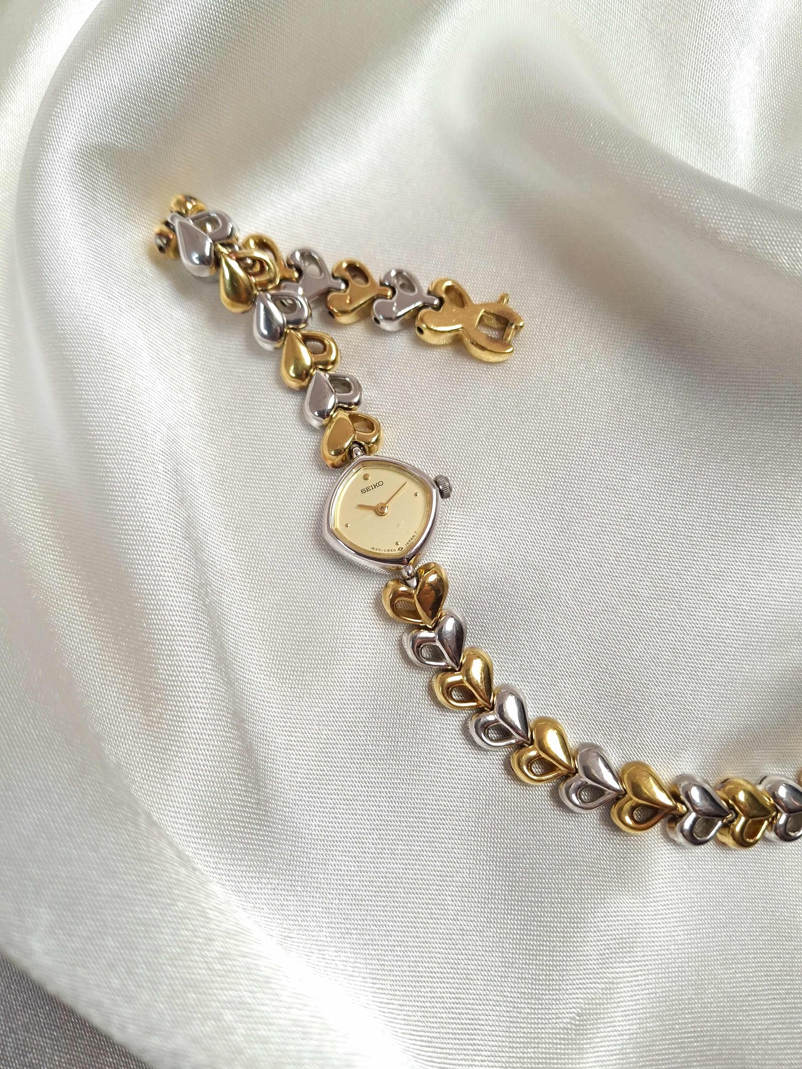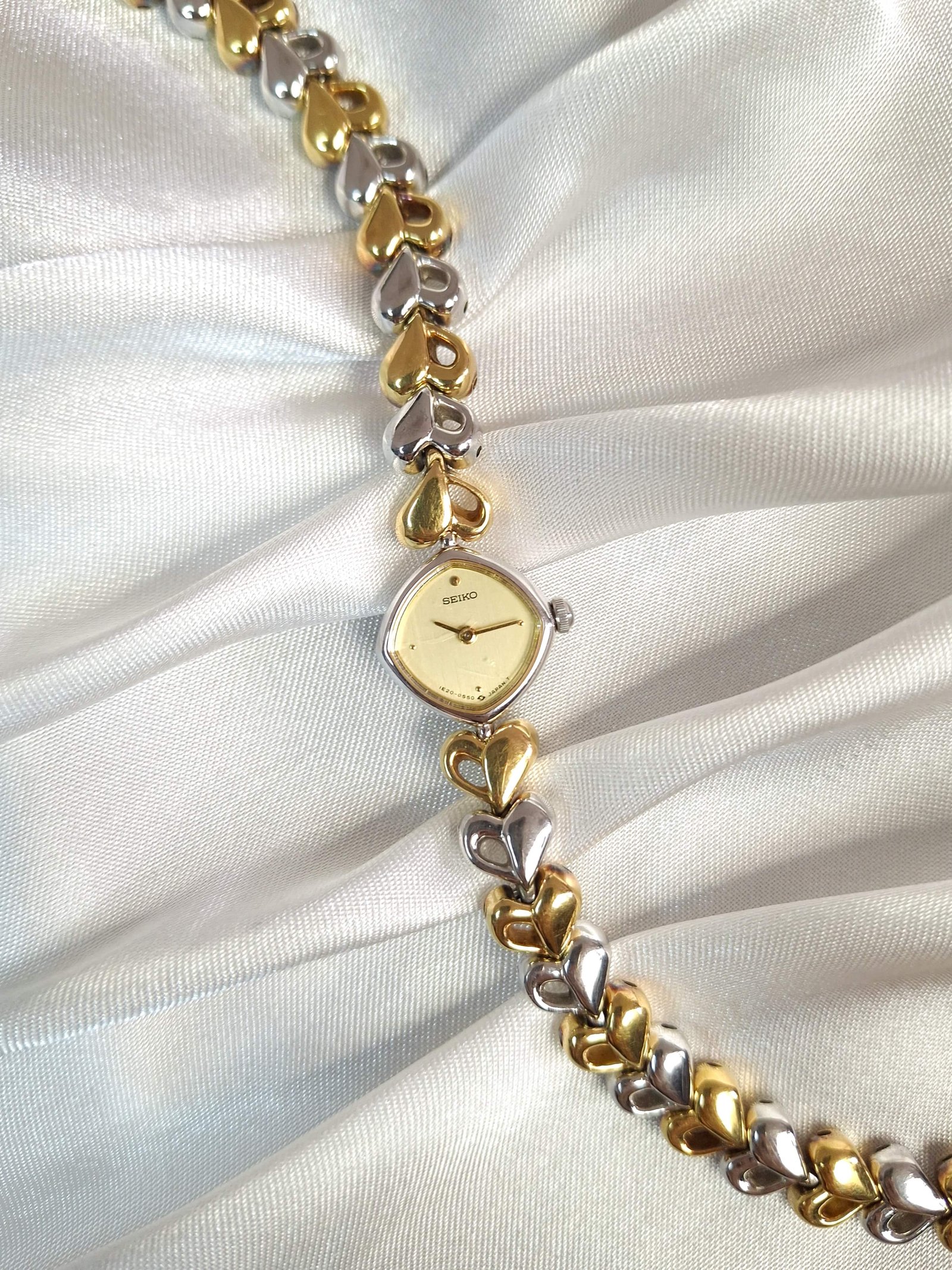 The Seiko 1E20-5280, often called the “Heart Chain,” is a graceful vintage timepiece that captures the soft elegance of 1990s design. Its standout feature is the bracelet — a flowing sequence of gold and silver heart-shaped links that wraps around the wrist like fine jewelry. The dial is simple and refined in a soft champagne tone, framed by a delicate round case that adds a timeless, feminine touch. Powered by Seiko’s trusted quartz movement, this watch is both beautiful and reliable. With its romantic design and refined finish, the Heart Chain is a rare piece that speaks quietly of style, sentiment, and vintage charm.